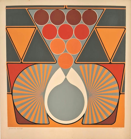 A exposição não se organiza segundo uma cronologia linear. Em vez disso, aproxima-se da noção de “tempo espiralar” (MARTINS, 2021), propondo um movimento de idas e vindas que ecoa o próprio gesto de construir e desconstruir a paisagem presente em suas obras. Nos trabalhos entre o final da década de 1960 e o início da de 1970 emergem serigrafias de grande complexidade, desenvolvidas a partir de numerosas camadas sobrepostas. Trata-se de um conjunto ainda pouco difundido, mesmo entre aqueles que acompanham mais de perto seu corpo de obra. Essa investigação rigorosa, dedicada às estruturas formais, conduz à pesquisa de mestrado intitulada Matrizes Modificadoras do Campo Plástico, defendida em 1976 na Faculdade de Arquitetura e Urbanismo da Universidade de São Paulo (FAU/USP), momento em que a geometria de Dionísio del Santo exerce influência decisiva (KATZ, 1997).